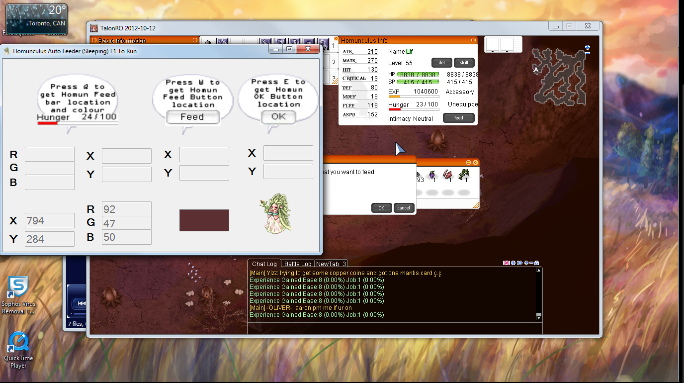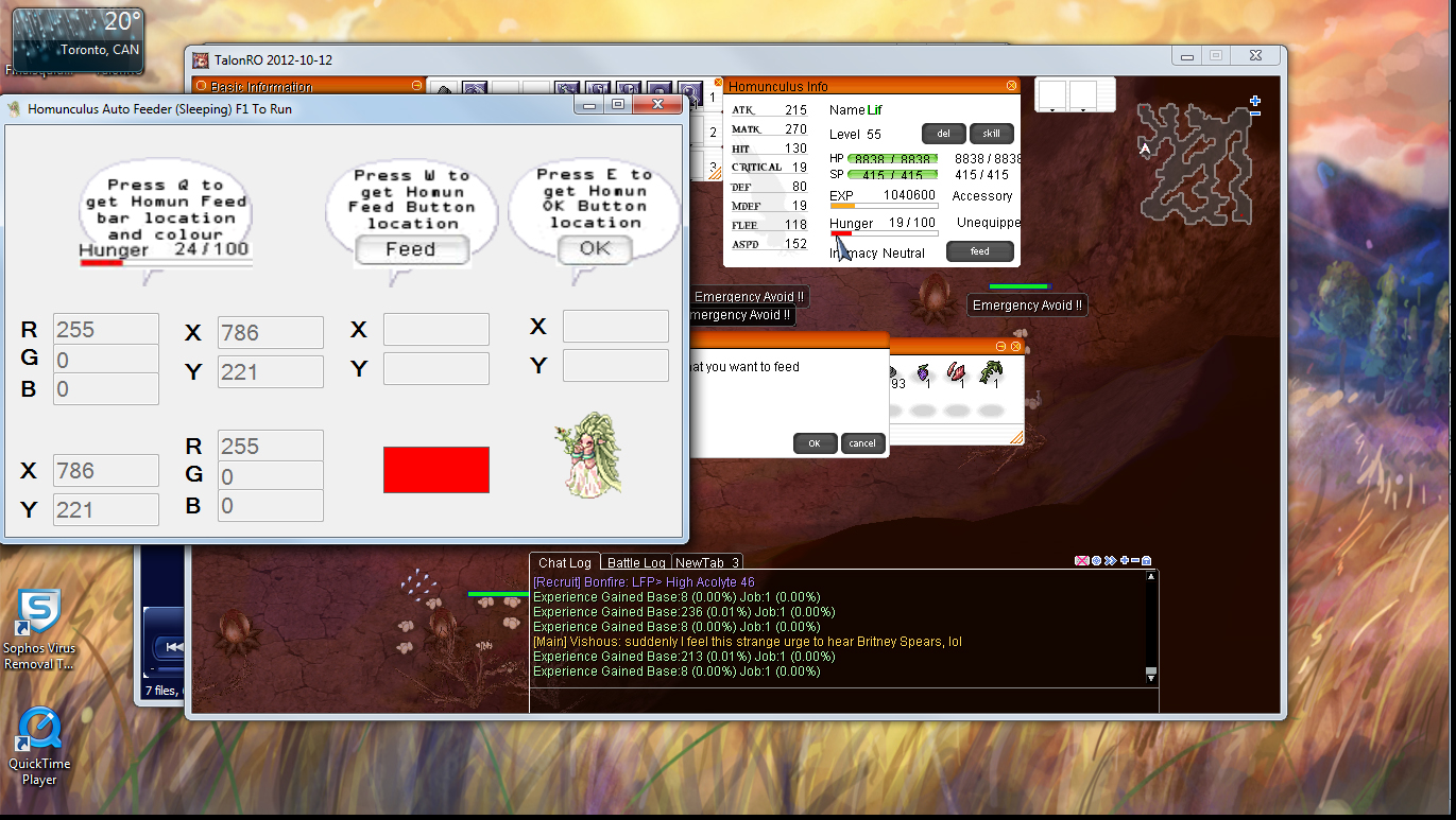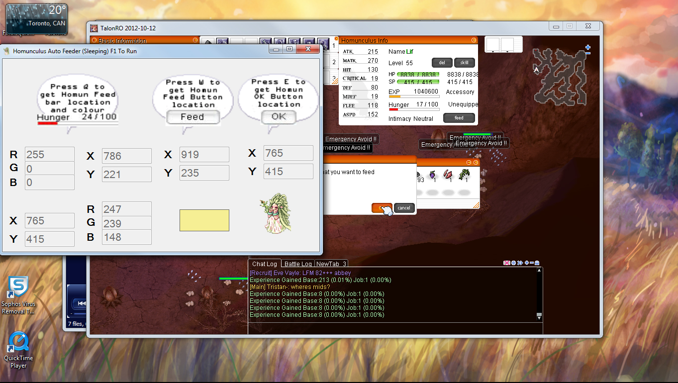 NOTE: Ragnarok MUST be the active window for this to work. If you can’t see it on your screen then this program can’t see it. This program acts as if you are constantly monitoring the window and acts accordingly. I recommend using this when you want to grind your homunculus while you sleep OR you have another computer to run this and RO on that you are not using.